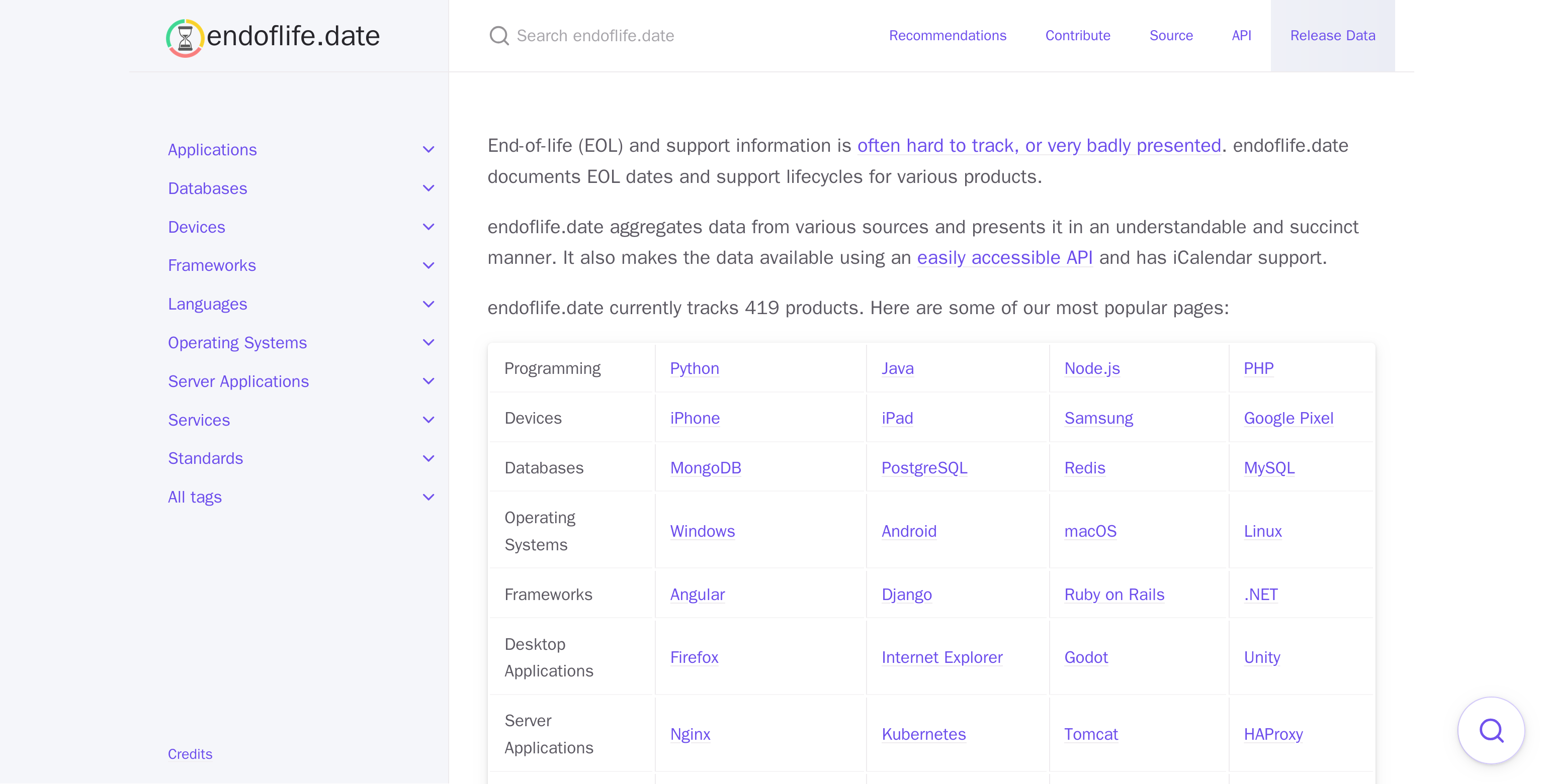 顾名思义,这个网站是专门查询软件、操作系统、硬件设备是否还在其生命周期内,是否还受到支持以及支持状态。包罗万象,涵盖了常见的大部分软件及设备,并不仅仅局限与编程相关的内容。