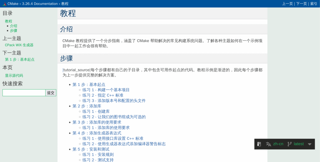 网址:https://cmake-doc.readthedocs.io/zh-cn/latest/guide/tutorial/index.html#