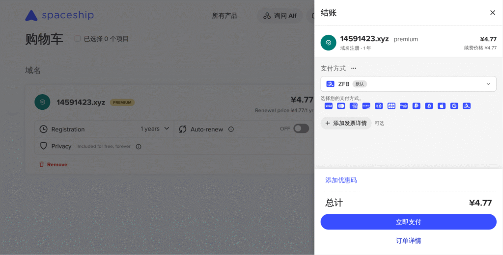 点击添加到购物车,再点击结账。如果没有账户,先注册一个账户。完成后就可以使用支付宝支付了。