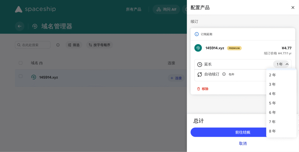 点击你刚刚购买的域名,在侧边栏选择延长订阅,根据需要选择延长的时间(最长为十年)。然后支付就可以了。